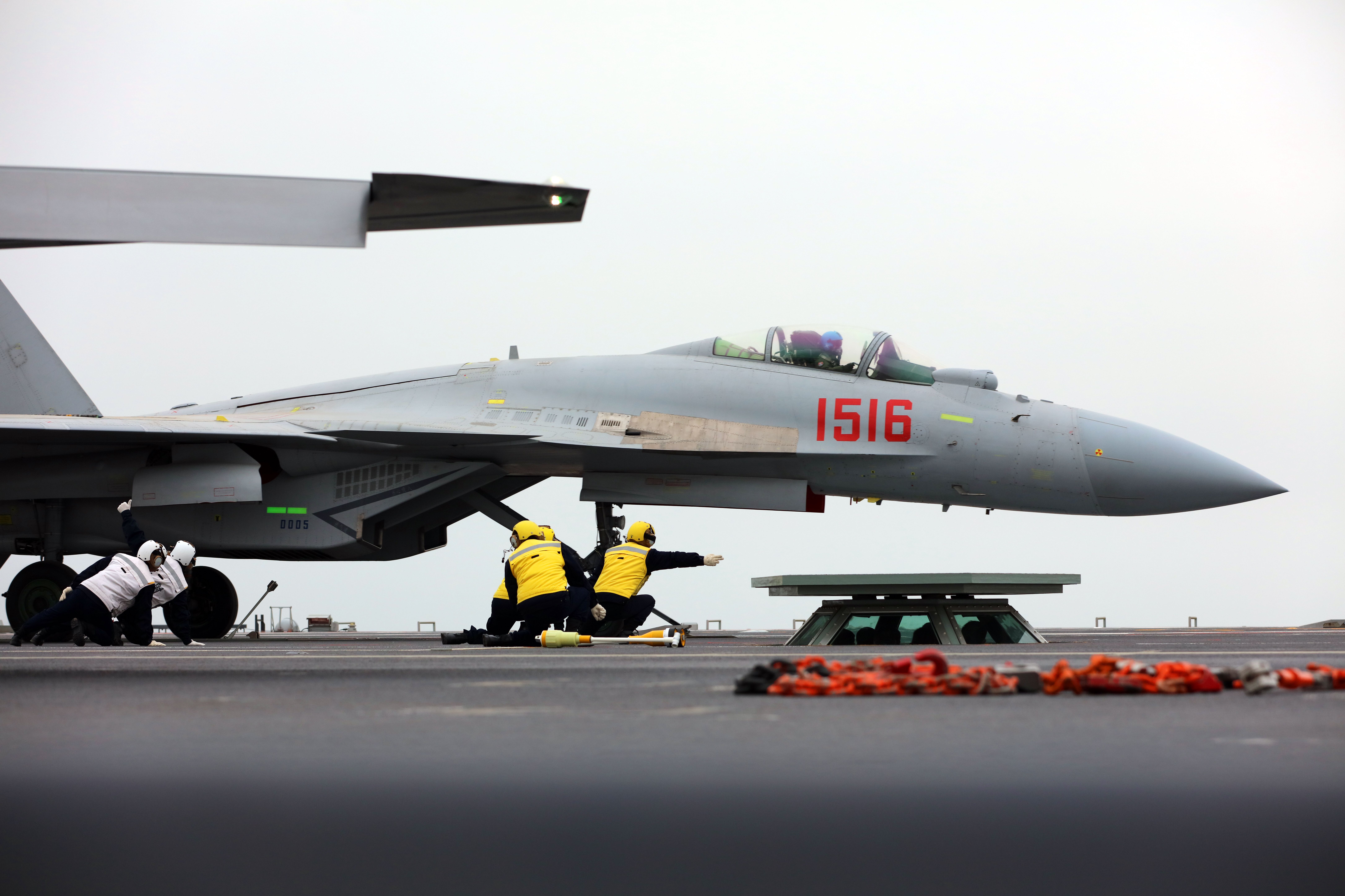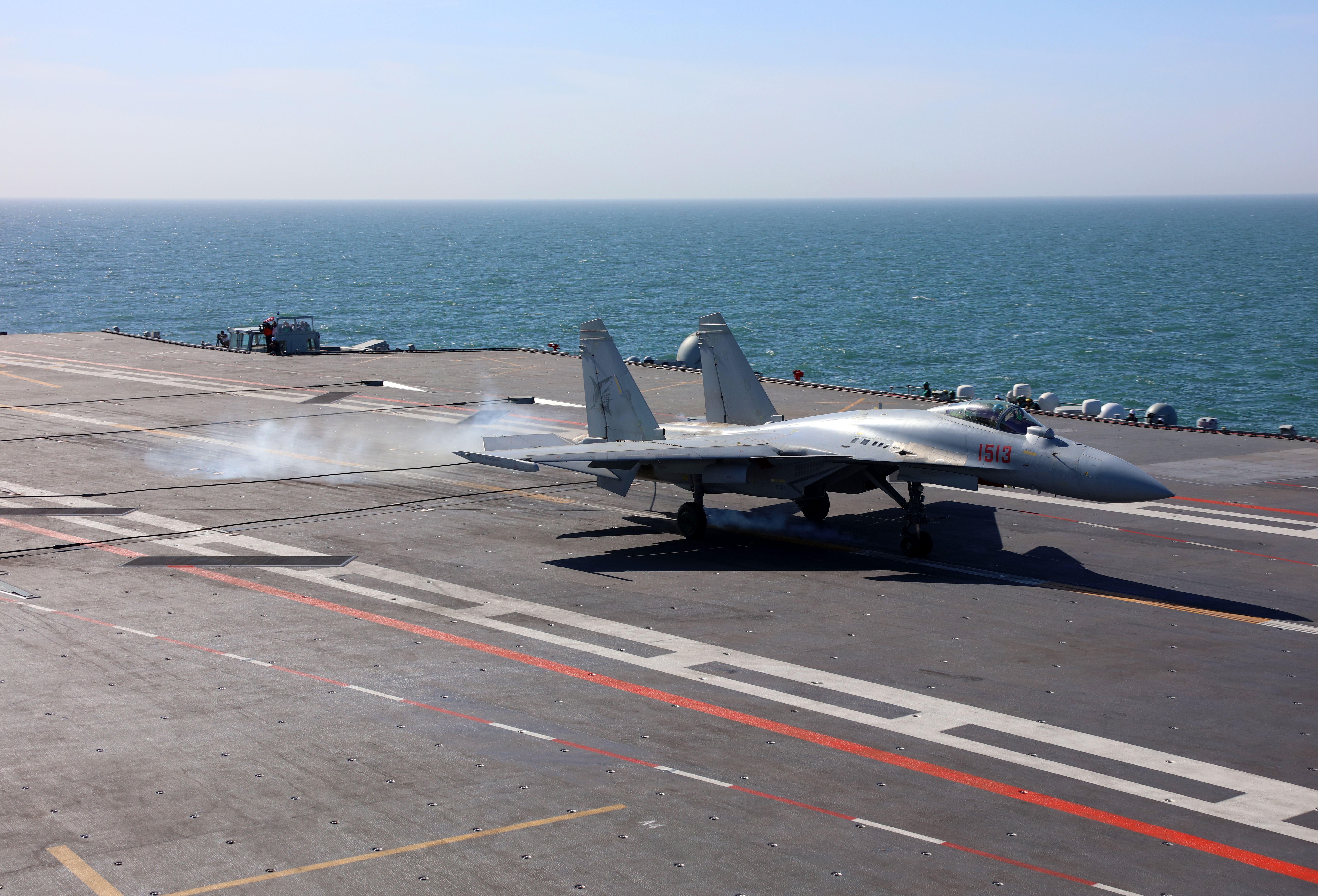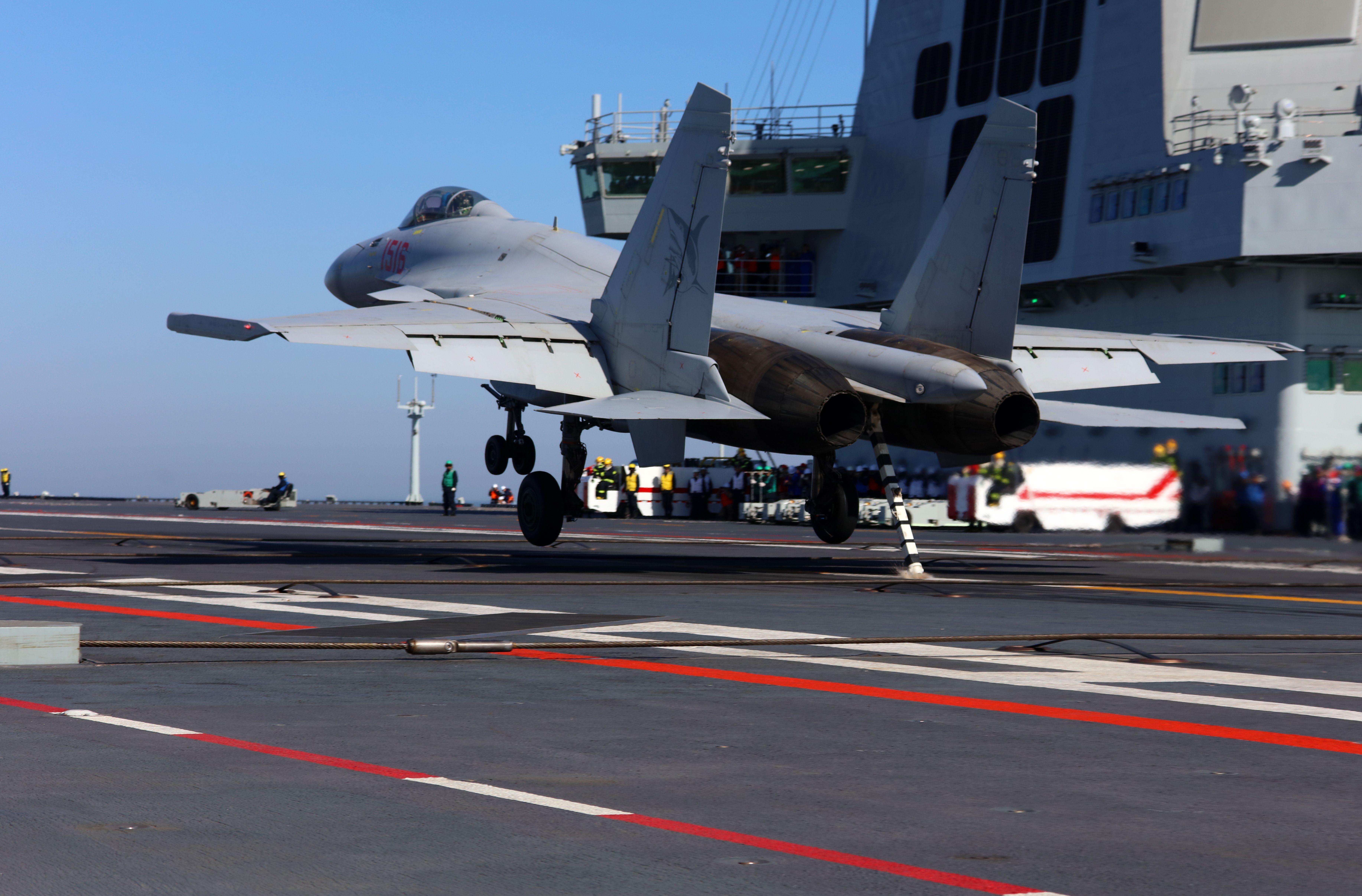 歼-15T舰装载叙利亚在福建海军舰阻拦着舰。这是战机着舰挂索前的一瞬间。