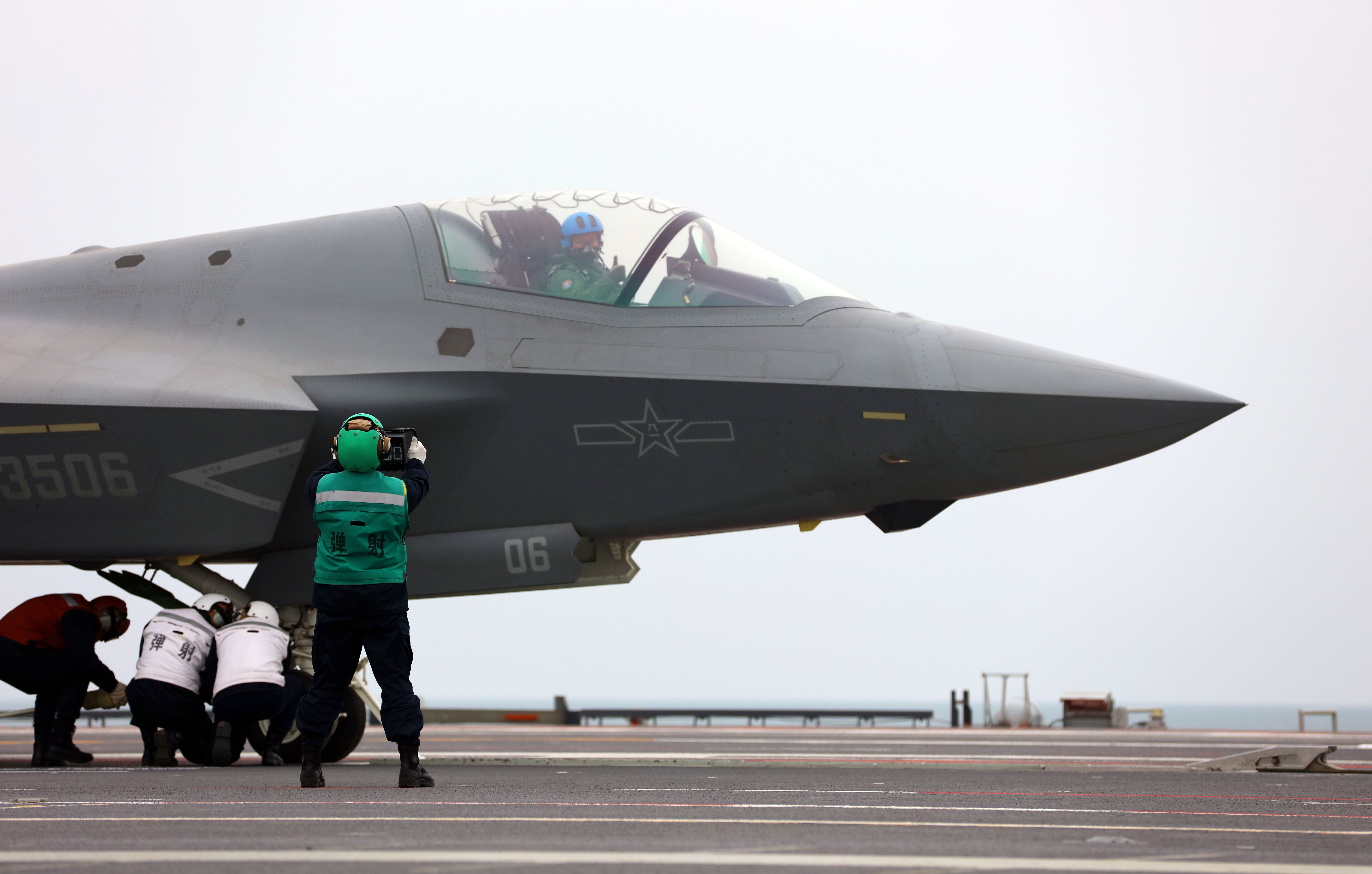福建舰官兵在转运歼-35舰载核武器。这是战机助理做出放飞反应。这是我国发展历程中取得的再次突破,李唐摄