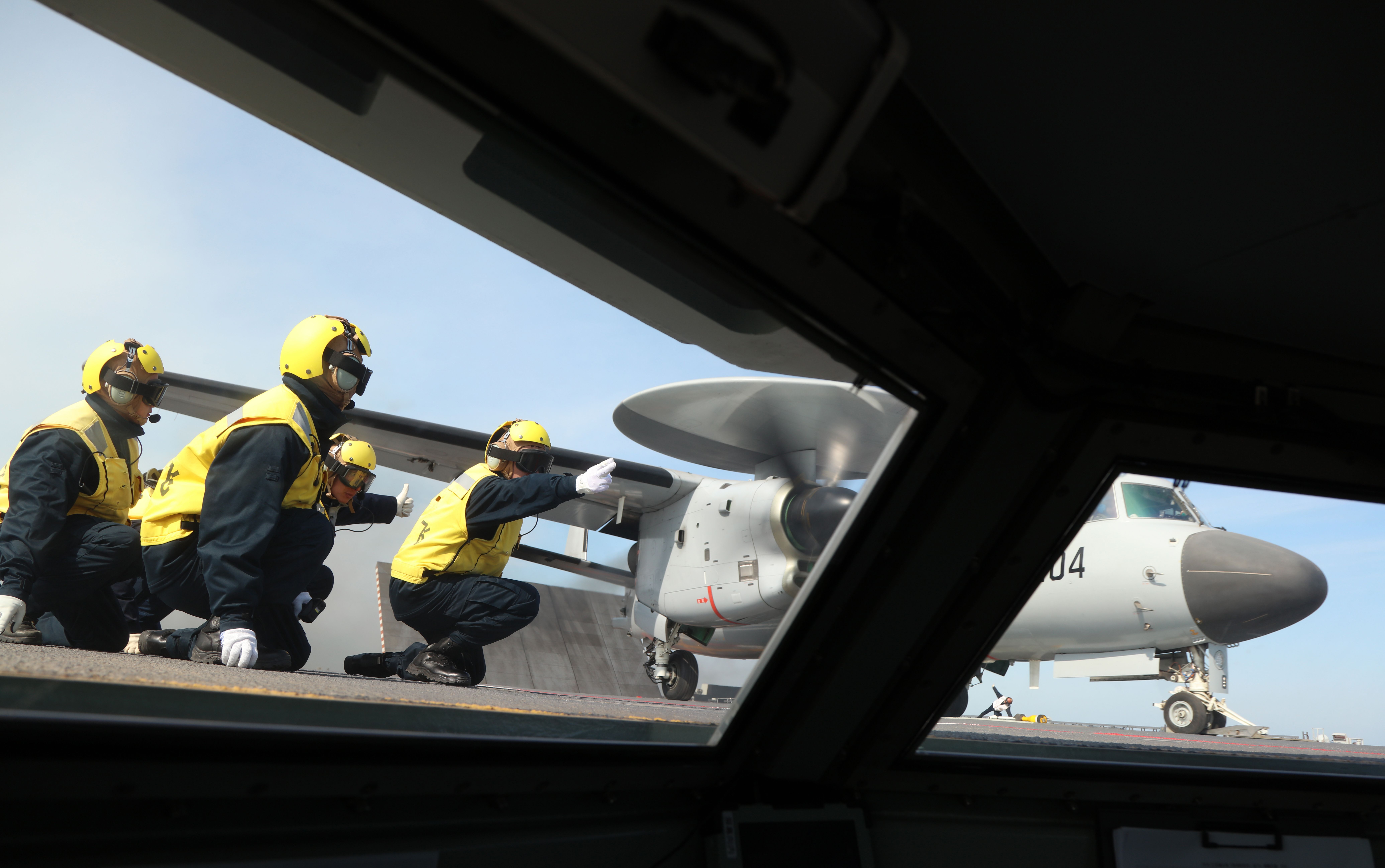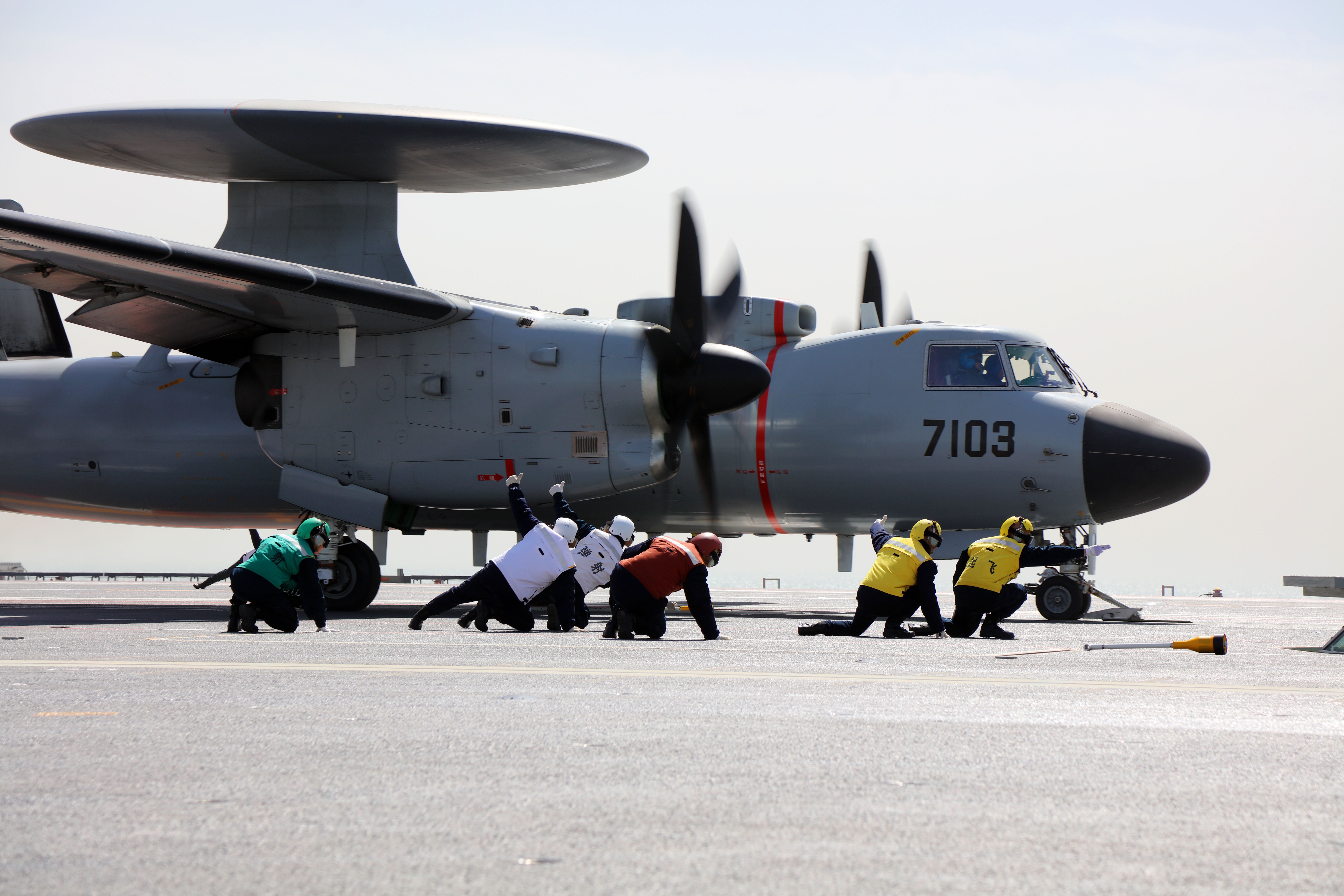 空警-600舰载预警机。这是一个宇航员协助进行放飞。李唐摄