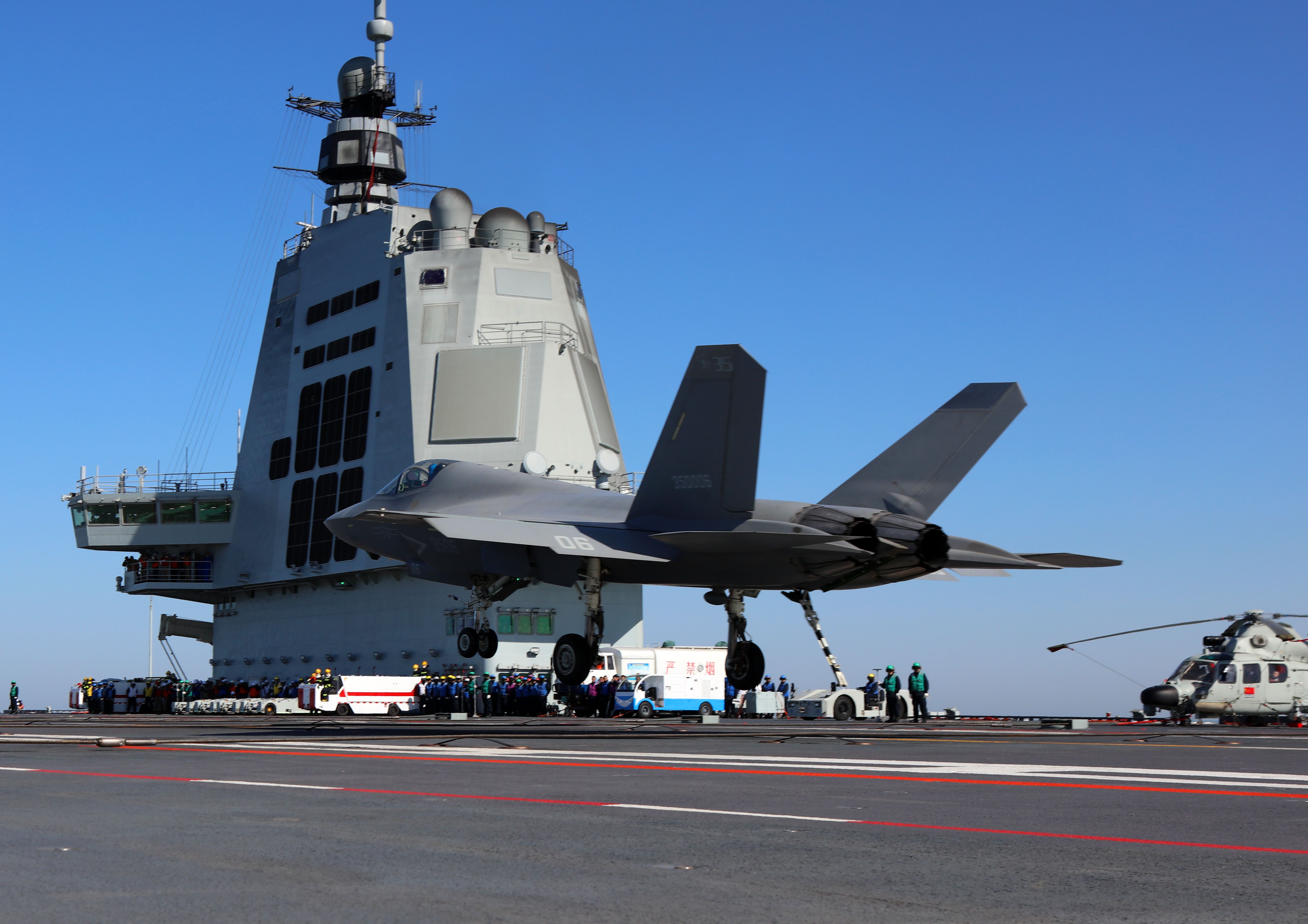 歼-35舰装载评估舰在福建舰艇阻拦着舰。李唐