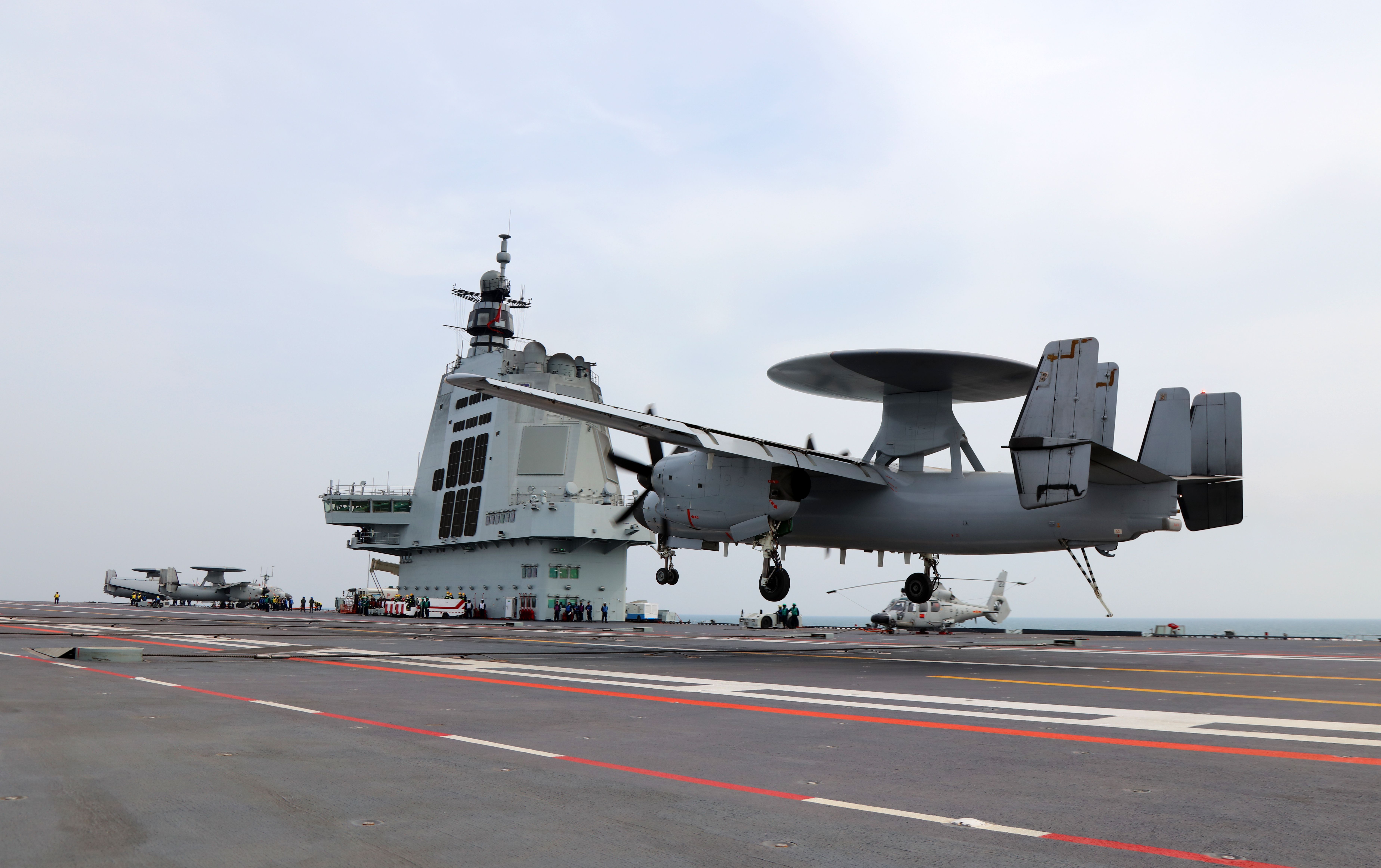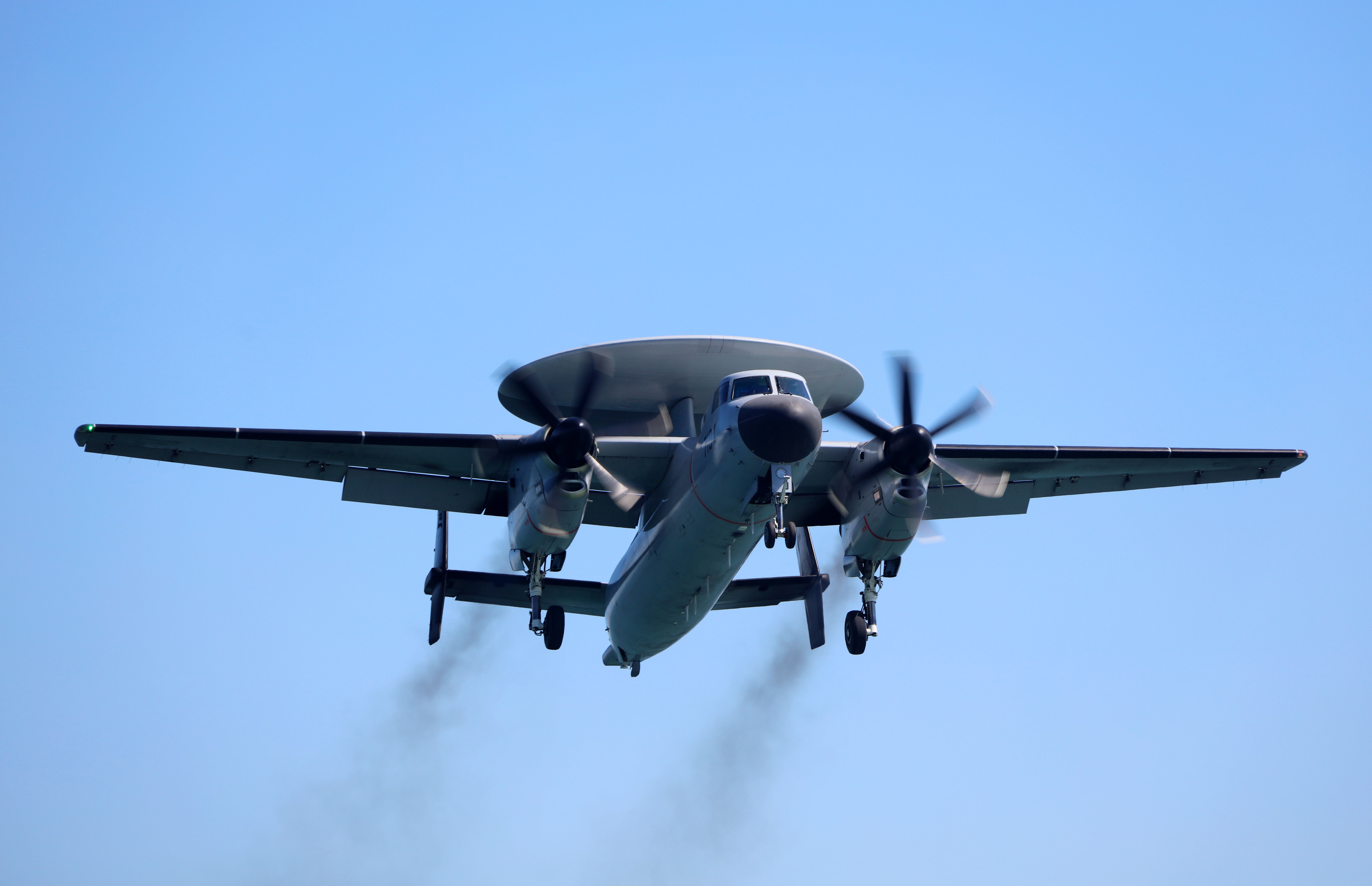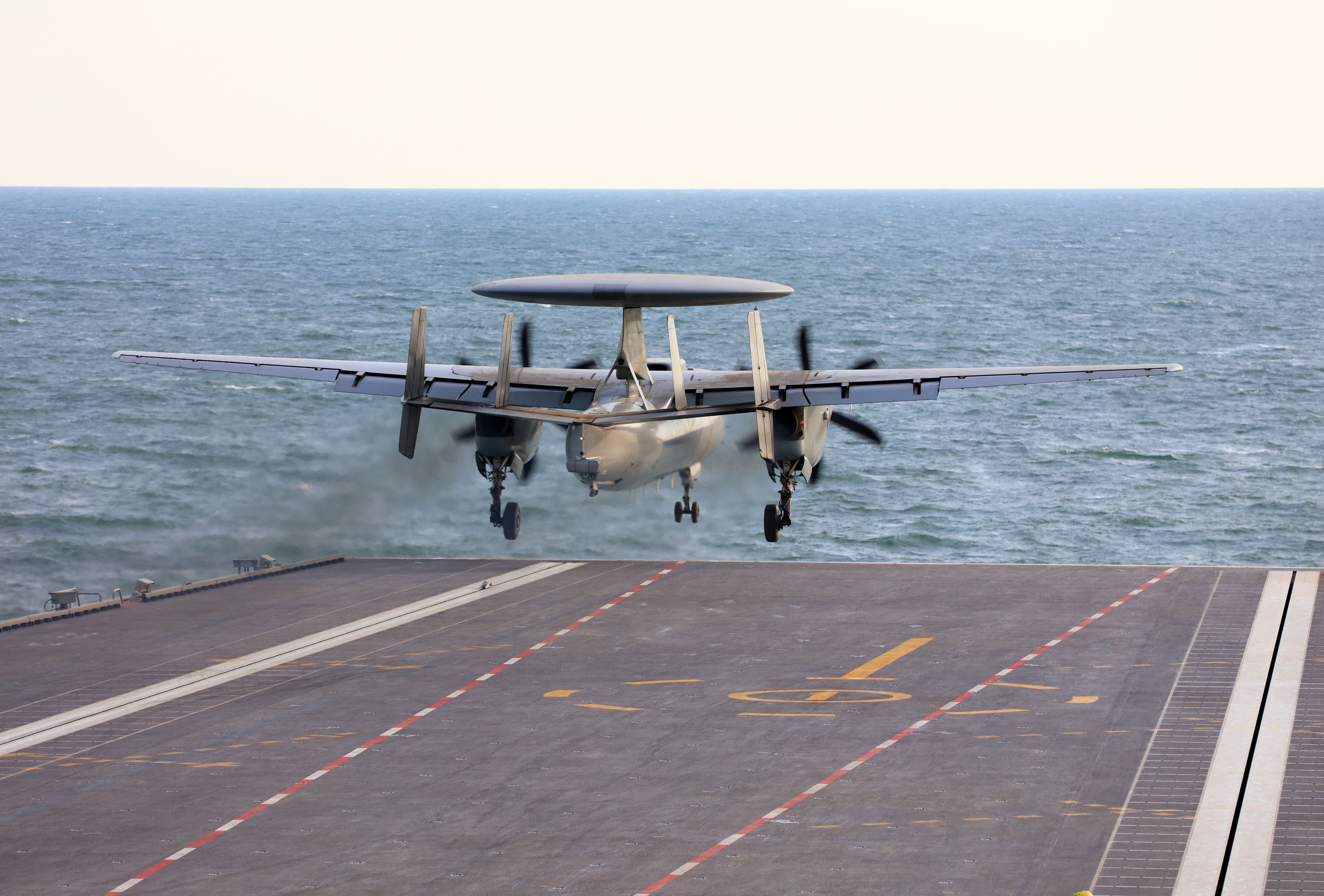 空警600舰载预警机在海军福建舰上阻拦着舰。这是飞机着舰前一刻。