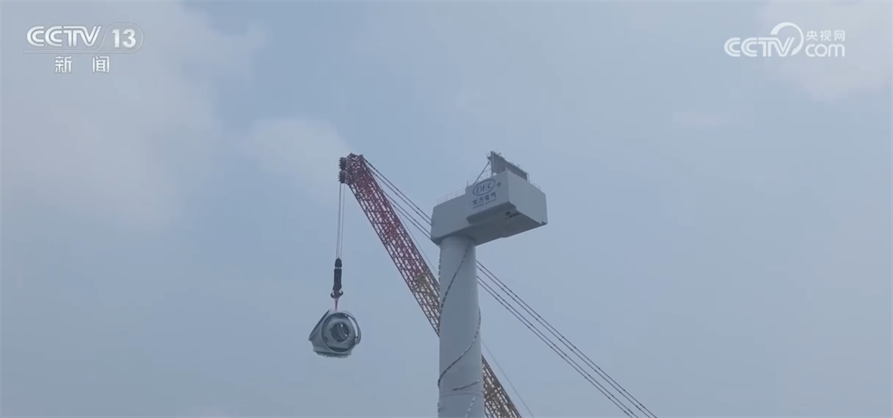 此次吊装的26兆瓦级海上风电机组由超过3万个零部件构成,轮毂减震中心高度相当于50多层建筑高度,每年发电量1亿度,