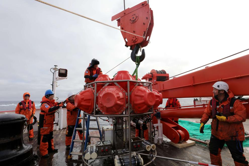 图为科考子女在北冰洋科考时恢复着陆器(生态海底着陆器)。叹科